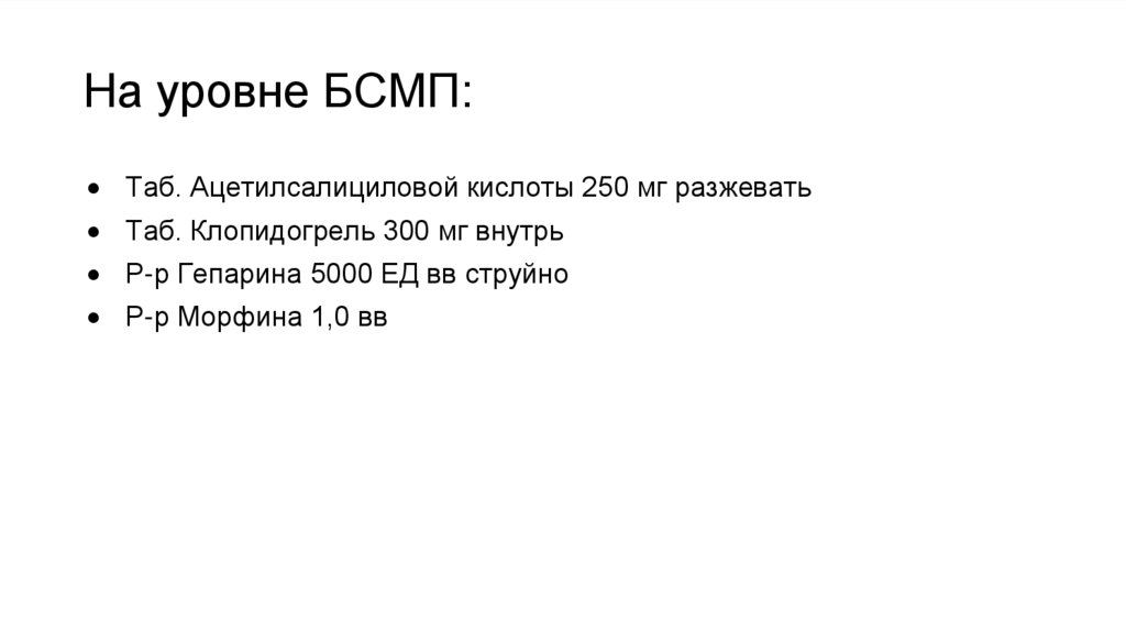 На уровне БСМП:Таб. Ацетилсалициловой кислоты 250 мг разжевать