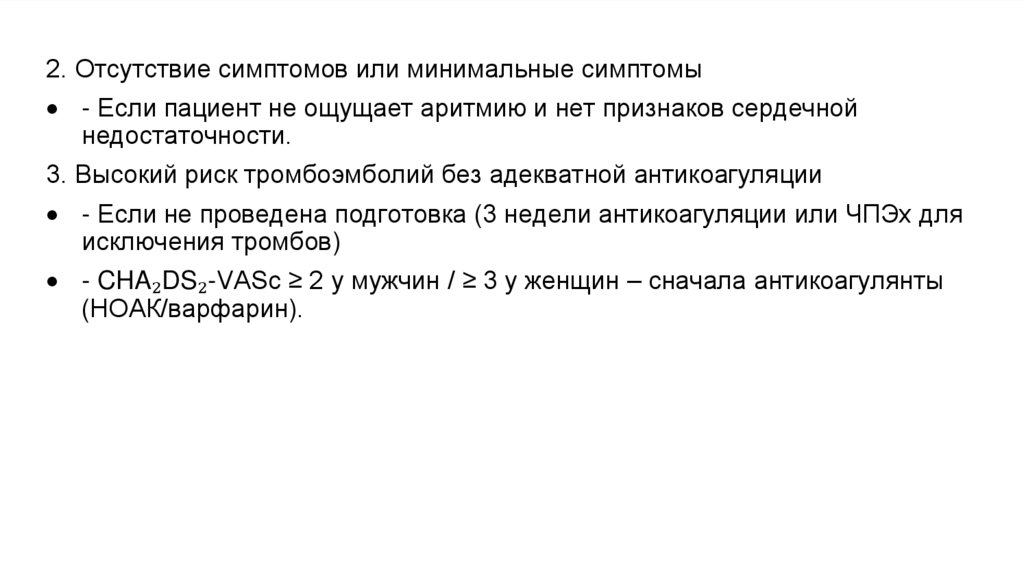 - Если не проведена подготовка (3 недели антикоагуляции или ЧПЭх для