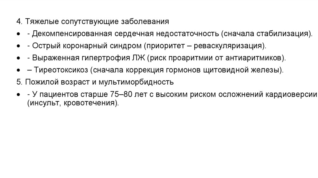 4. Тяжелые сопутствующие заболевания- Декомпенсированная сердечная недостаточность (сначала стабилизация).