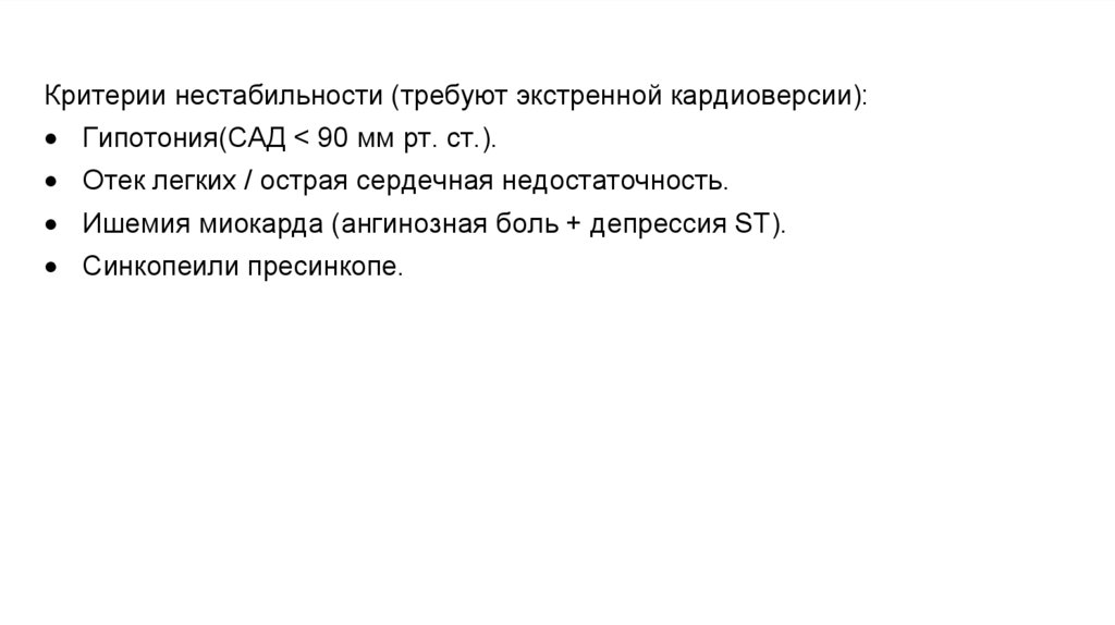 Критерии нестабильности (требуют экстренной кардиоверсии):Гипотония(САД < 90 мм рт. ст.).