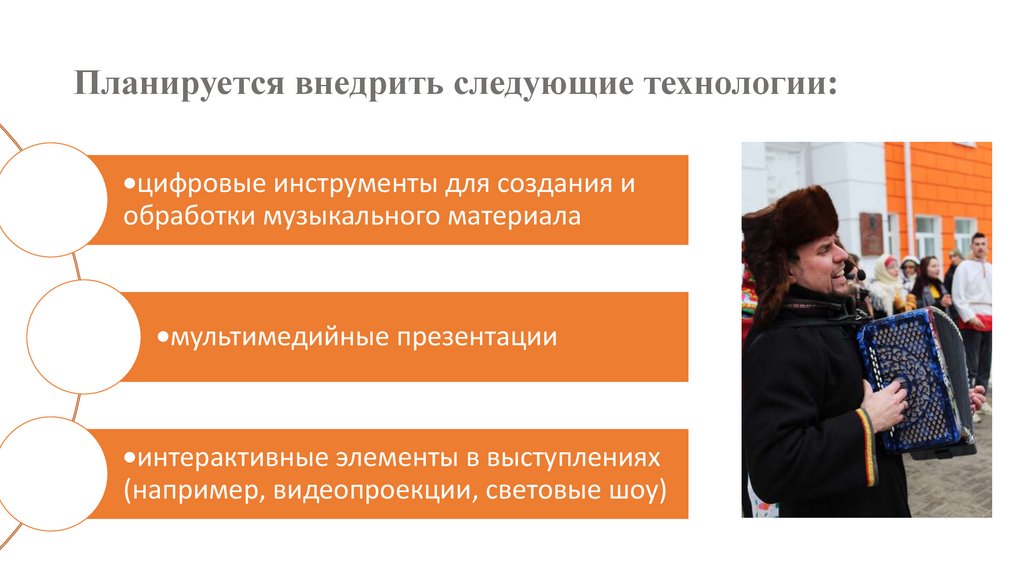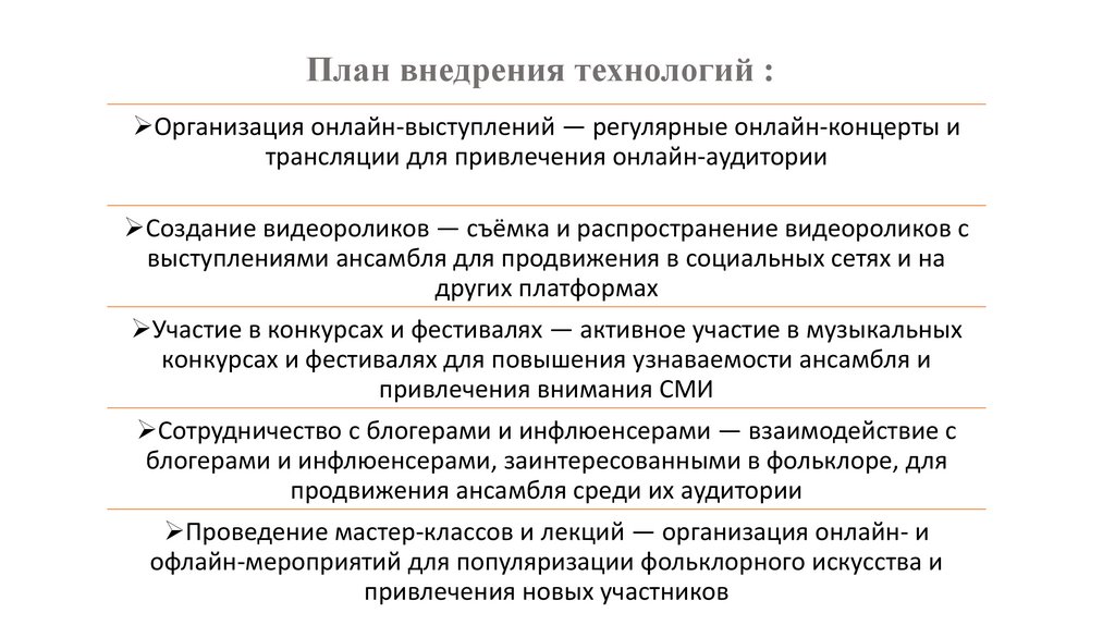 План внедрения технологий :Организация онлайн-выступлений — регулярные онлайн-концерты и
