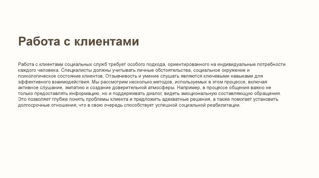 Работа с клиентамиРабота с клиентами социальных служб требует особого подхода, ориентированного на индивидуальные потребности