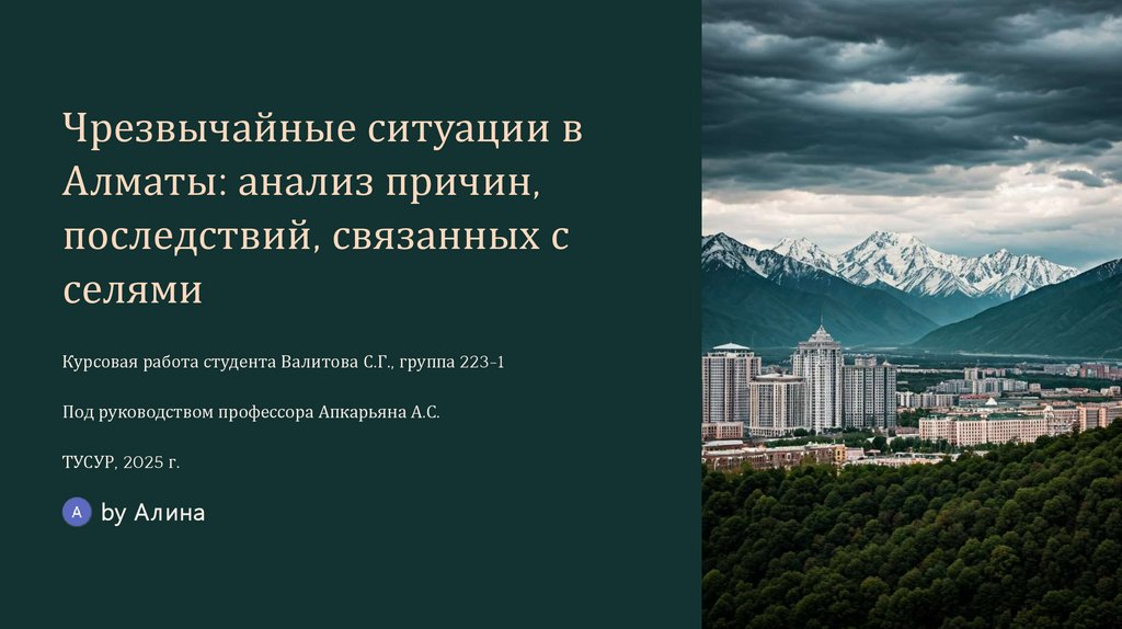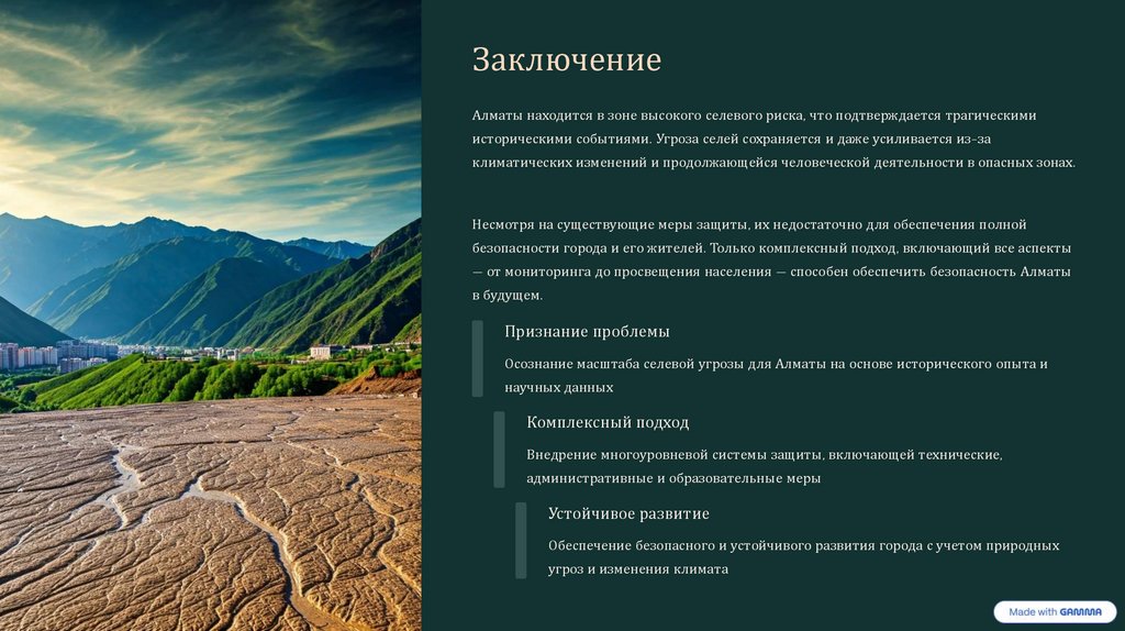 ЗаключениеАлматы находится в зоне высокого селевого риска, что подтверждается трагическими