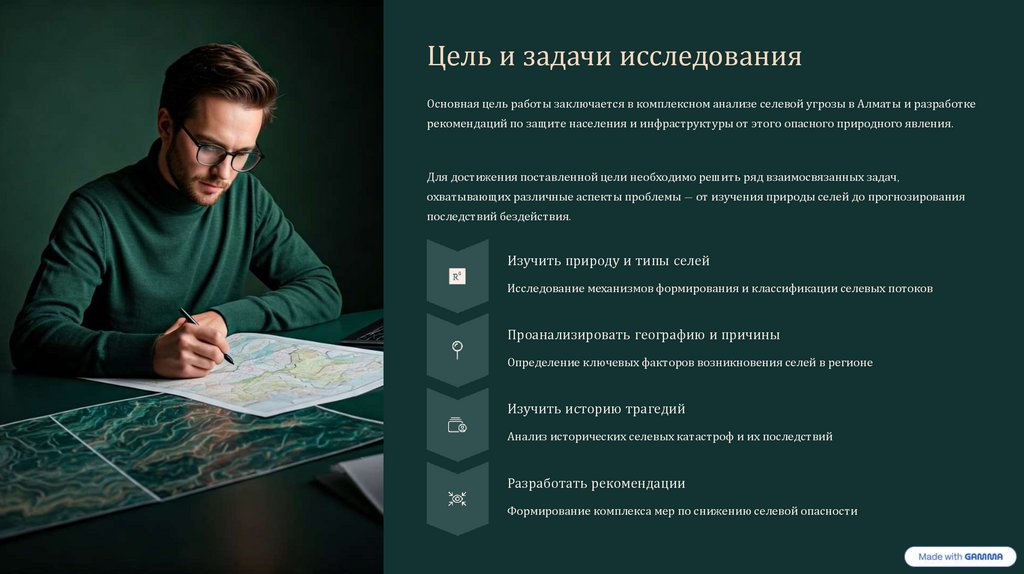 Цель и задачи исследованияОсновная цель работы заключается в комплексном анализе селевой угрозы в Алматы и разработке