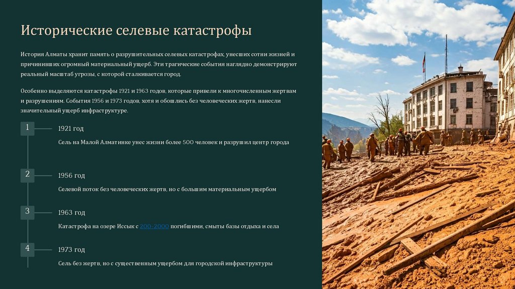 Исторические селевые катастрофыИстория Алматы хранит память о разрушительных селевых катастрофах, унесших сотни жизней и