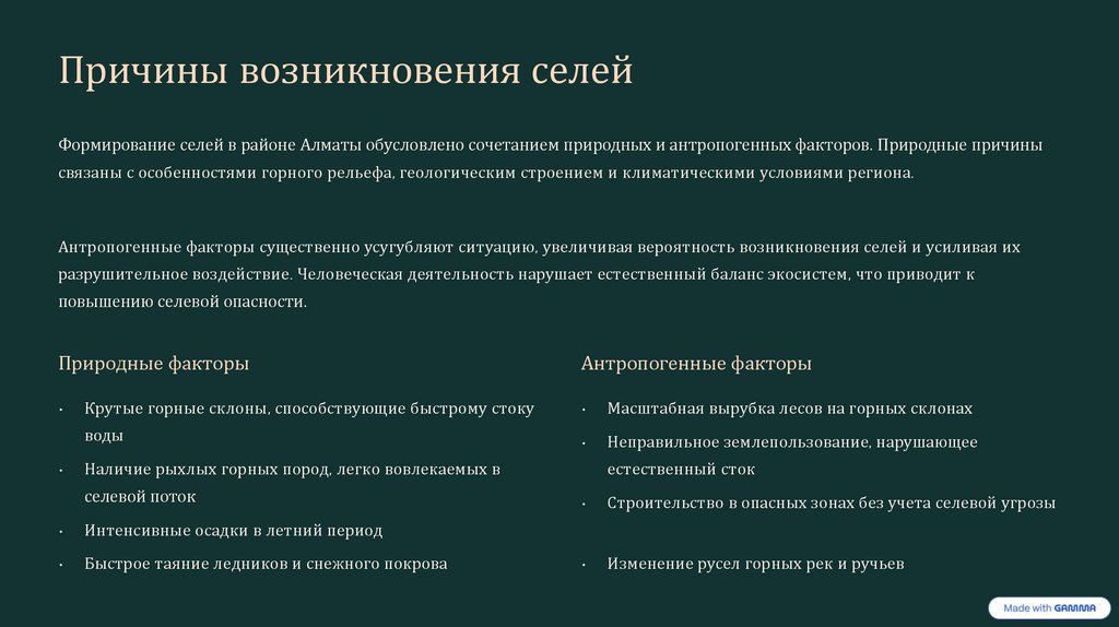Причины возникновения селейФормирование селей в районе Алматы обусловлено сочетанием природных и антропогенных факторов. Природные причины
