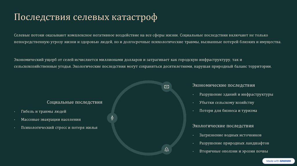 Последствия селевых катастрофСелевые потоки оказывают комплексное негативное воздействие на все сферы жизни. Социальные последствия включают не только