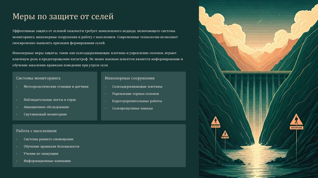 Меры по защите от селейЭффективная защита от селевой опасности требует комплексного подхода, включающего системы