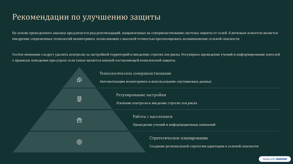 Рекомендации по улучшению защитыНа основе проведенного анализа предлагается ряд рекомендаций, направленных на совершенствование системы защиты от селей. Ключевым аспектом является