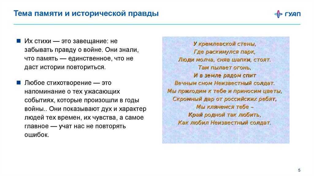 Тема памяти и исторической правдыИх стихи — это завещание: не