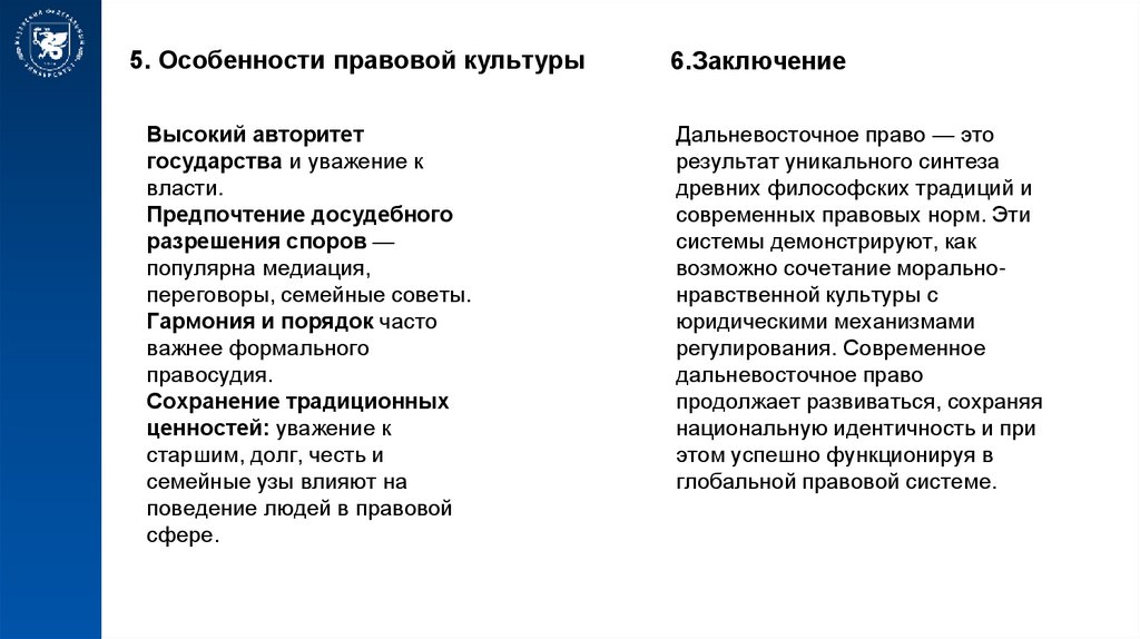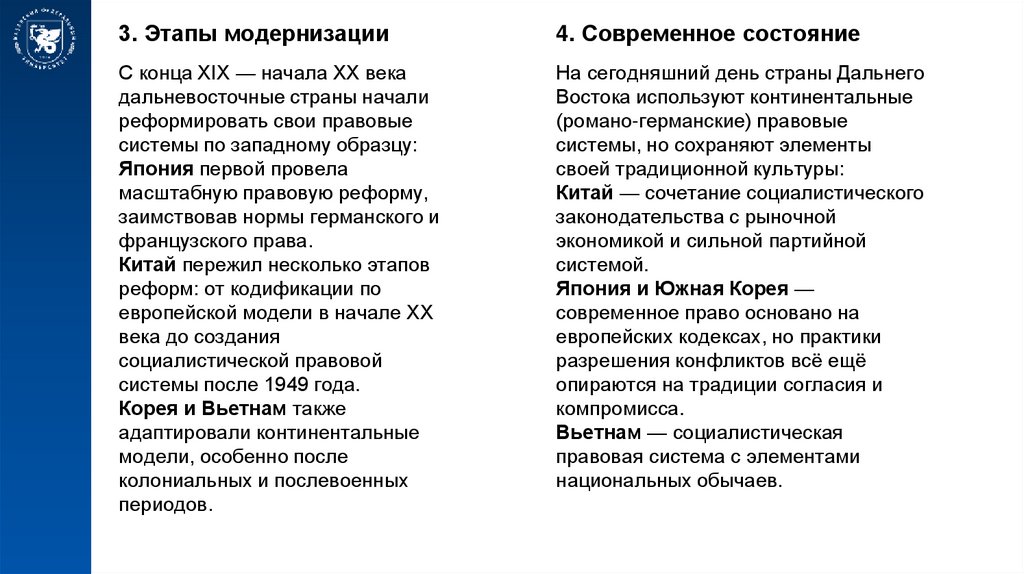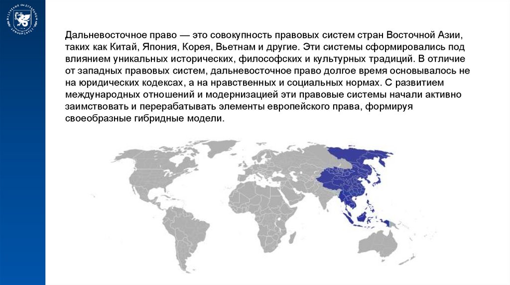.Дальневосточное право — это совокупность правовых систем стран Восточной Азии,таких как Китай, Япония, Корея, Вьетнам и другие. Эти системы сформировались под