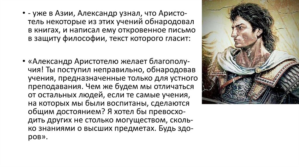 • - уже в Азии, Александр узнал, что Аристотель некоторые из этих учений обнародовалв книгах, и написал ему откровенное письмо