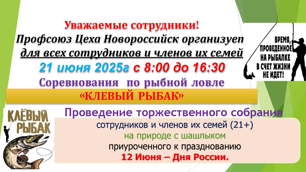 1. Уважаемые сотрудники! Профсоюз Цеха Новороссийск организует для всех сотрудников и членов их семей 21 июня 2025г с 8:00 до