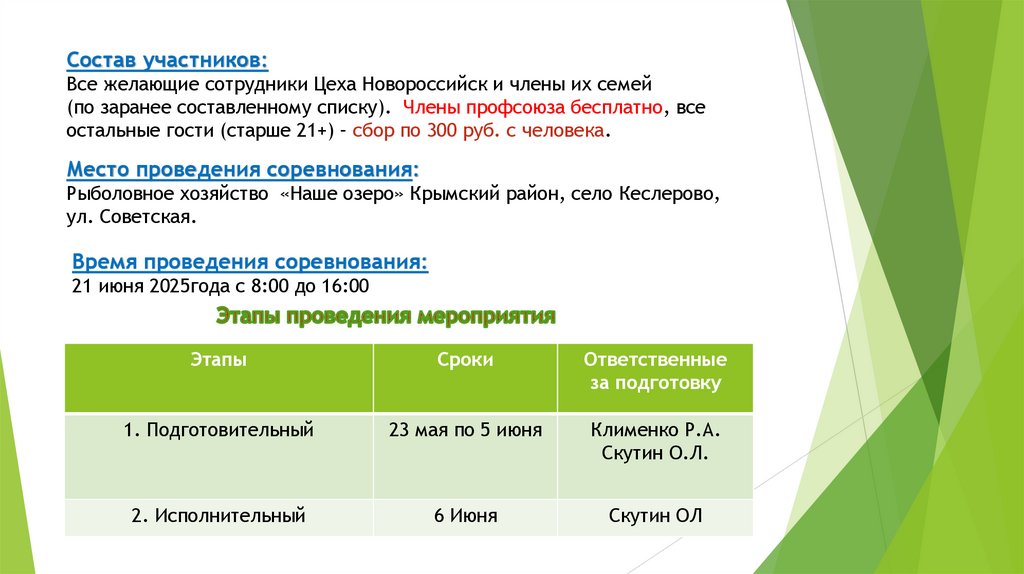 Состав участников:Все желающие сотрудники Цеха Новороссийск и члены их семей