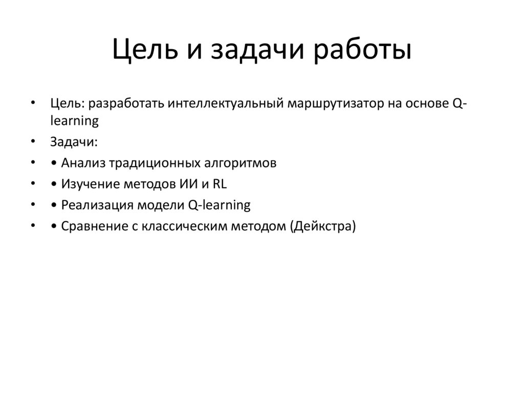 Цель и задачи работы• Цель: разработать интеллектуальный маршрутизатор на основе Qlearning