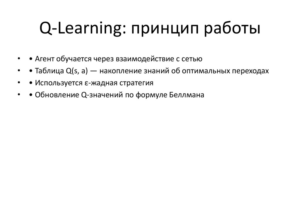 Q-Learning: принцип работы• Агент обучается через взаимодействие с сетью