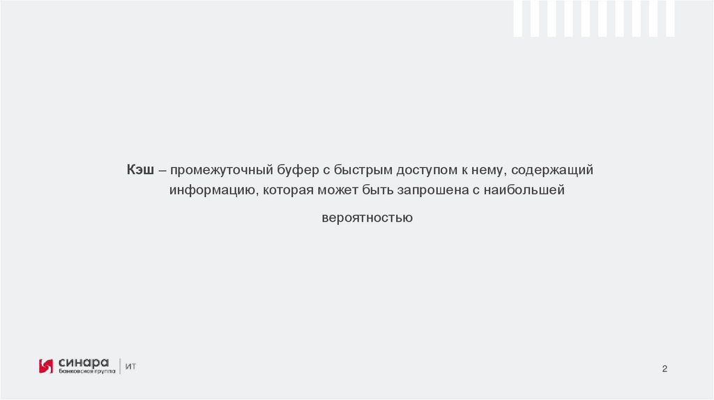 Кэш – промежуточный буфер с быстрым доступом к нему, содержащийинформацию, которая может быть запрошена с наибольшей