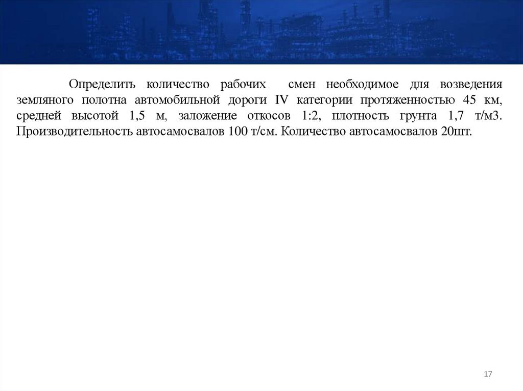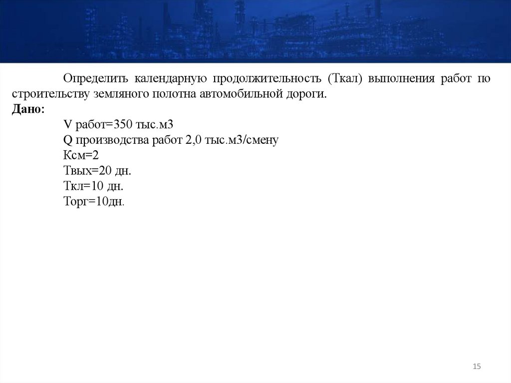 Определить календарную продолжительность (Ткал) выполнения работ построительству земляного полотна автомобильной дороги.