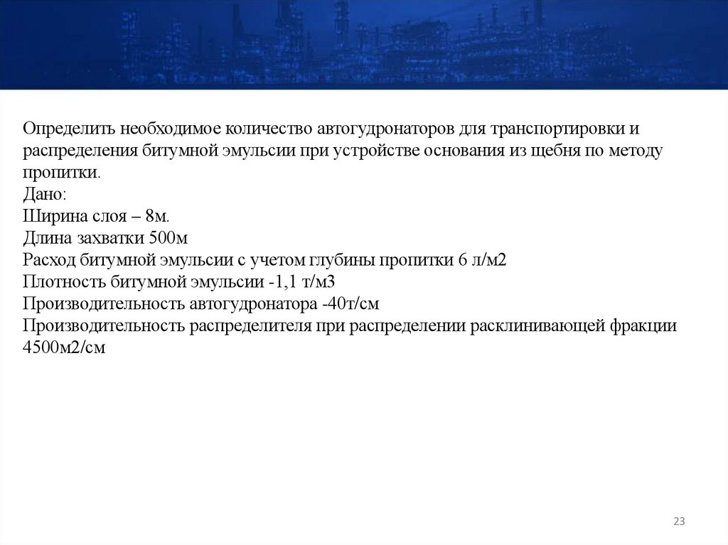 Определить необходимое количество автогудронаторов для транспортировки ираспределения битумной эмульсии при устройстве основания из щебня по методу