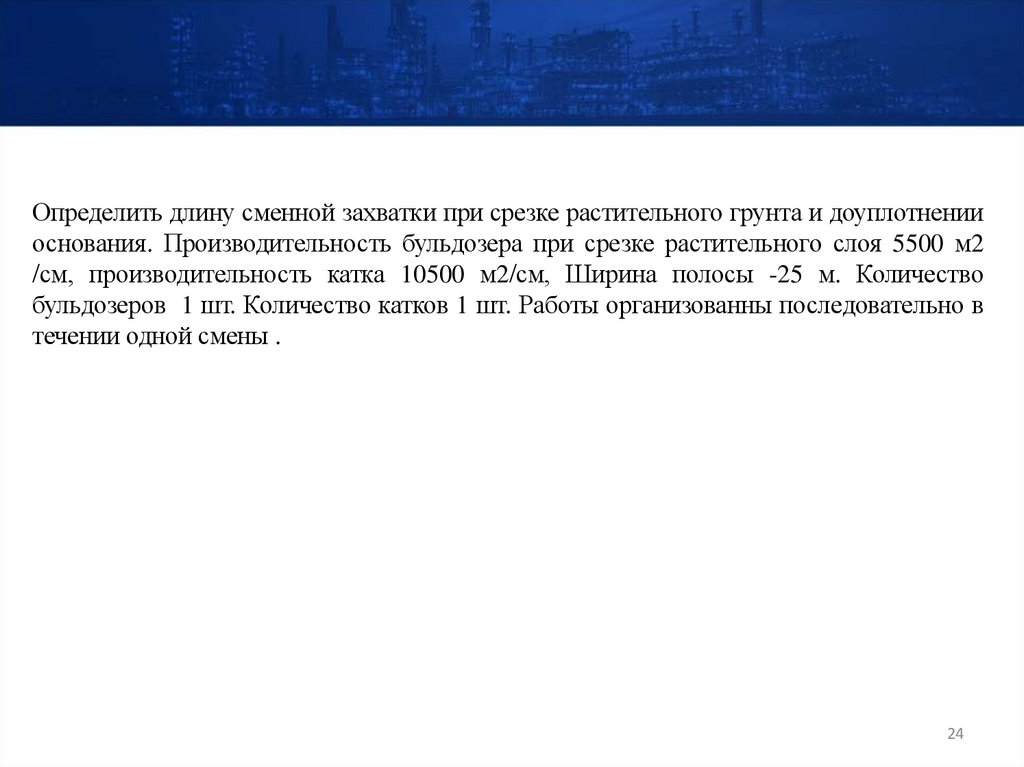 Определить длину сменной захватки при срезке растительного грунта и доуплотненииоснования. Производительность бульдозера при срезке растительного слоя 5500 м2