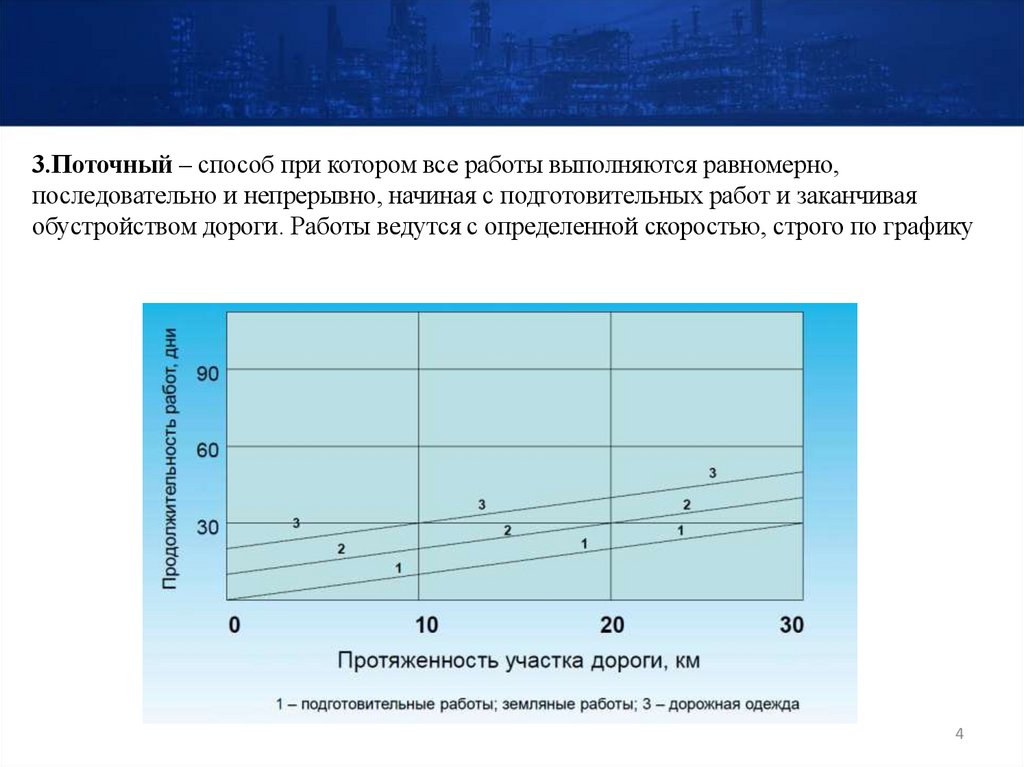 3.Поточный – способ при котором все работы выполняются равномерно,последовательно и непрерывно, начиная с подготовительных работ и заканчивая