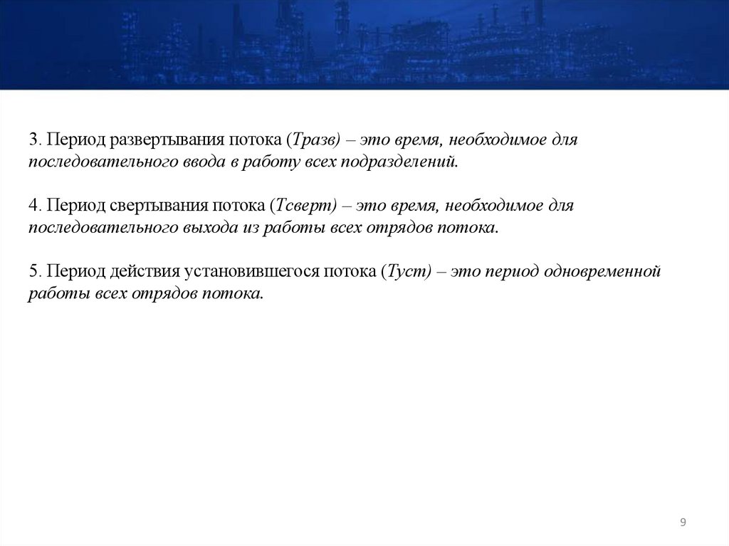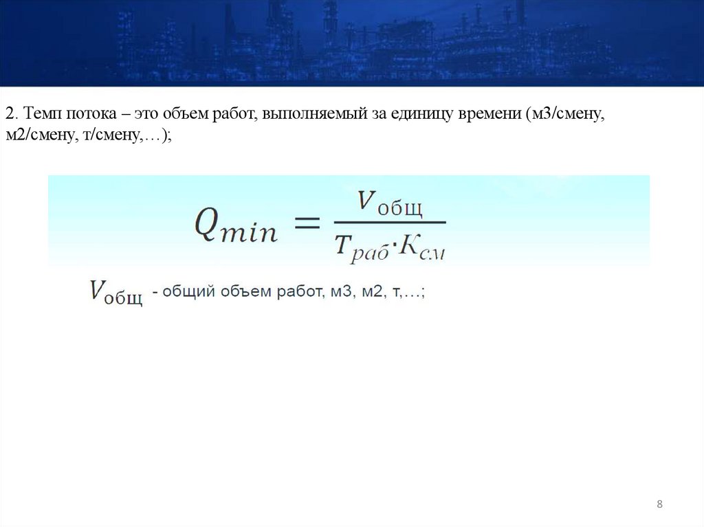 2. Темп потока – это объем работ, выполняемый за единицу времени (м3/смену,м2/смену, т/смену,…);