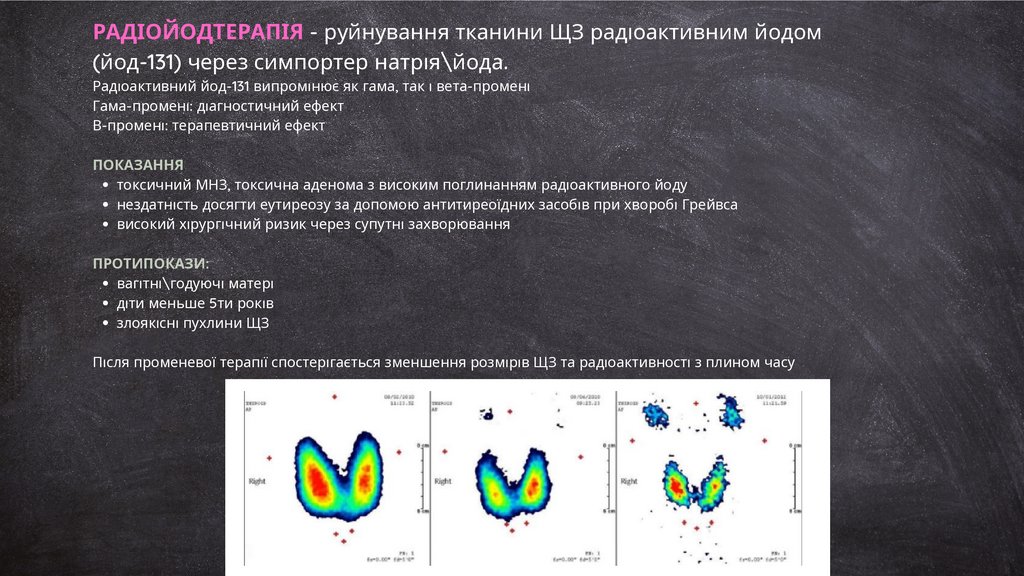 РАДІОЙОДТЕРАПІЯ - руйнування тканини ЩЗ радіоактивним йодом(йод-131) через симпортер натрія\йода.