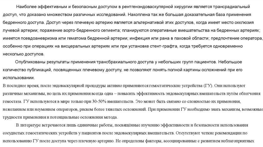Наиболее эффективным и безопасным доступом в рентгенэндоваскулярной хирургии является трансрадиальныйдоступ, что доказано множеством различных исследований. Накоплена так же большая доказательная база применения