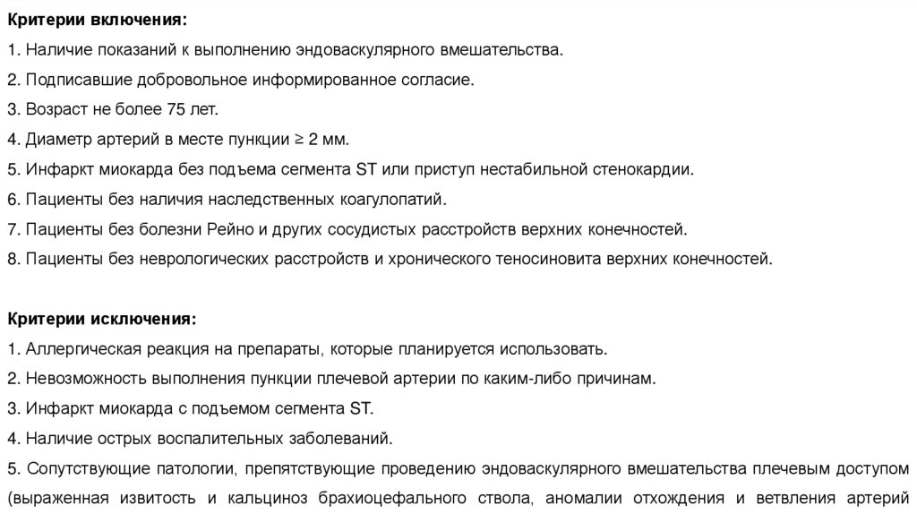 Критерии включения:1. Наличие показаний к выполнению эндоваскулярного вмешательства.