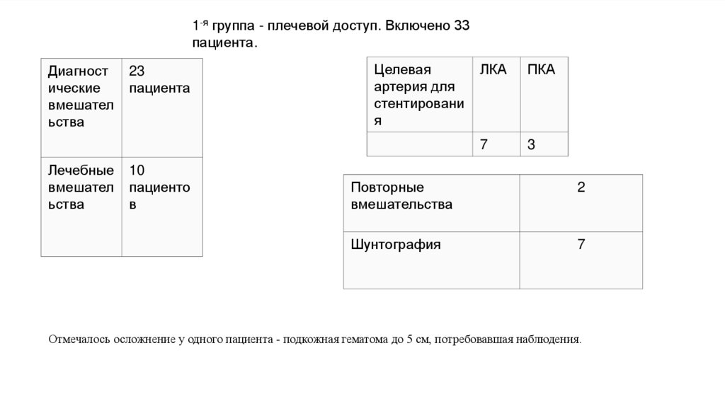 выделены 2 подгруппы: подгруппа с повторными эндоваскулярными вмешательствами через плечевую артерию, и