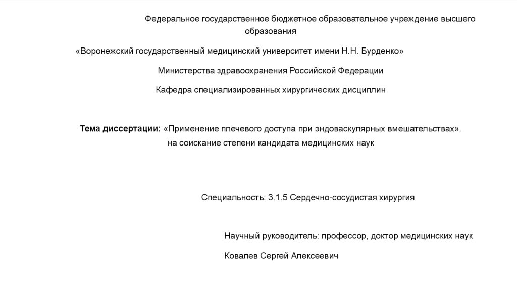 Тема диссертации: «Применение плечевого доступа при эндоваскулярных вмешательствах».