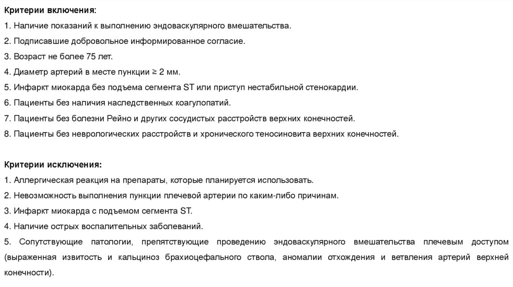 Критерии включения:1. Наличие показаний к выполнению эндоваскулярного вмешательства.