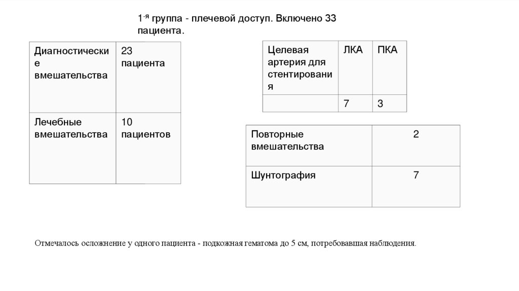 выделены 2 подгруппы: подгруппа с повторными эндоваскулярными вмешательствами через плечевую артерию, и