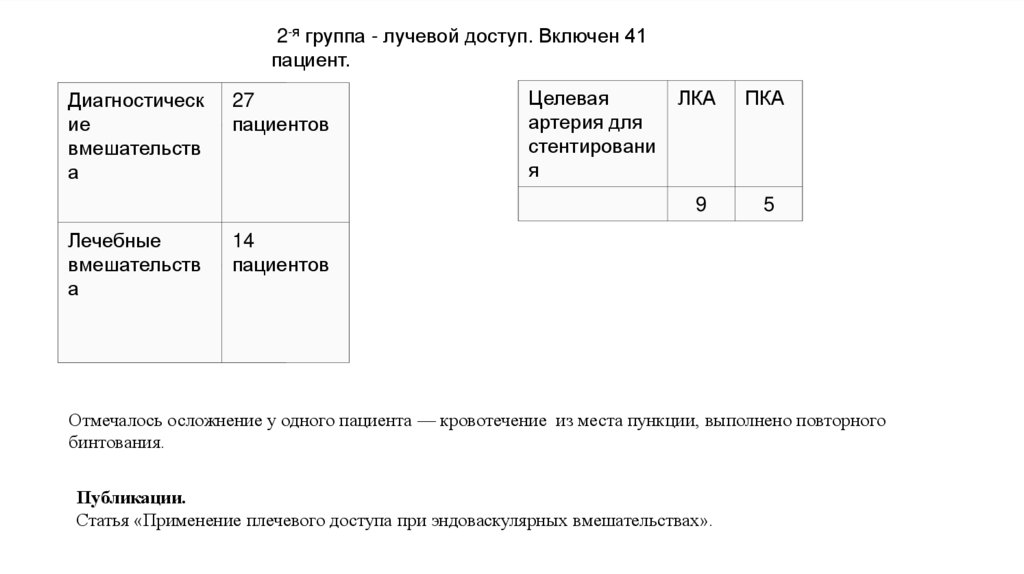 Опубликованы результаты применения трансбрахиального доступа у небольших групп пациентов. Небольшое количество