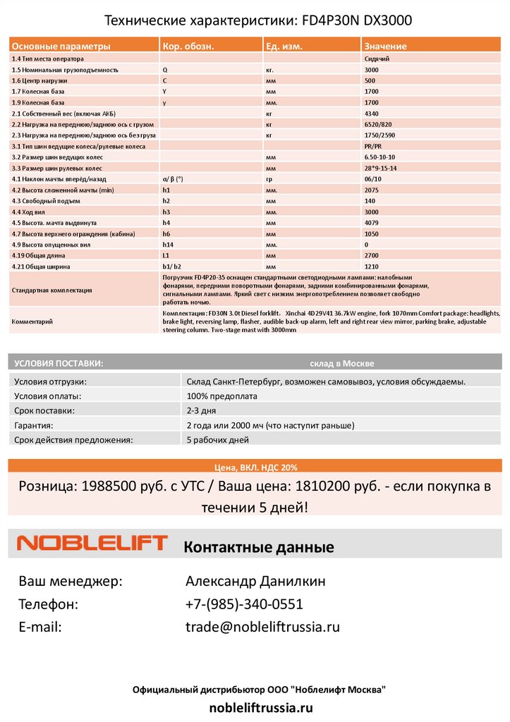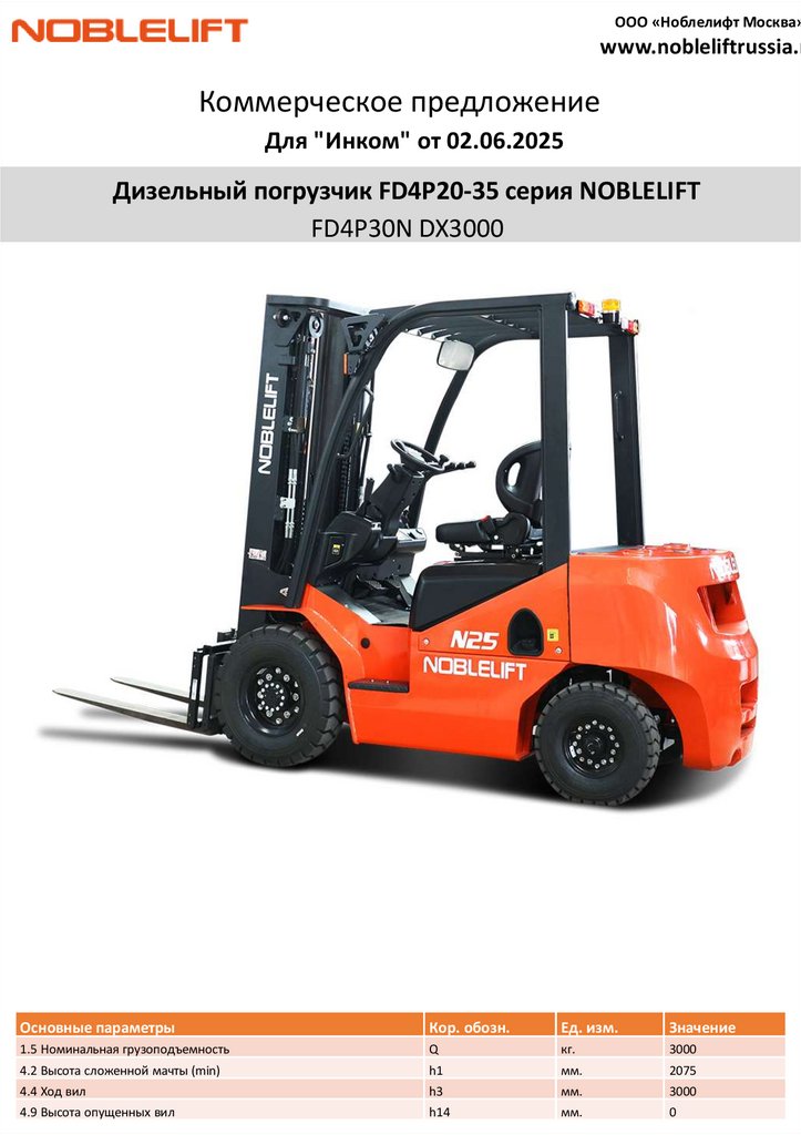 Коммерческое предложение для "Инком" от 02.06.2025. Дизельный погрузчик FD4P20-35 серия NOBLELIFT