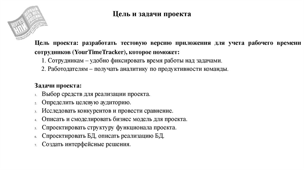 Цель и задачи проектаЦель проекта: разработать тестовую версию приложения для учета рабочего времени