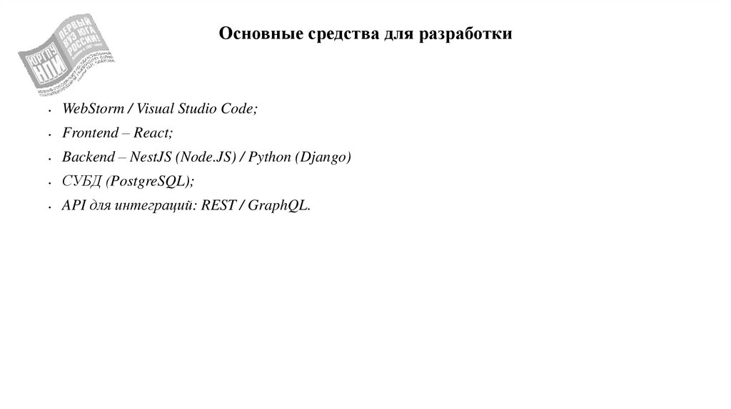Основные средства для разработкиWebStorm / Visual Studio Code;