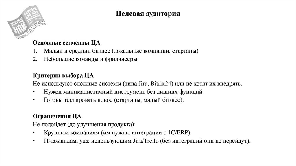 • IT-командам, уже использующим Jira/Trello (без интеграций они не перейдут).