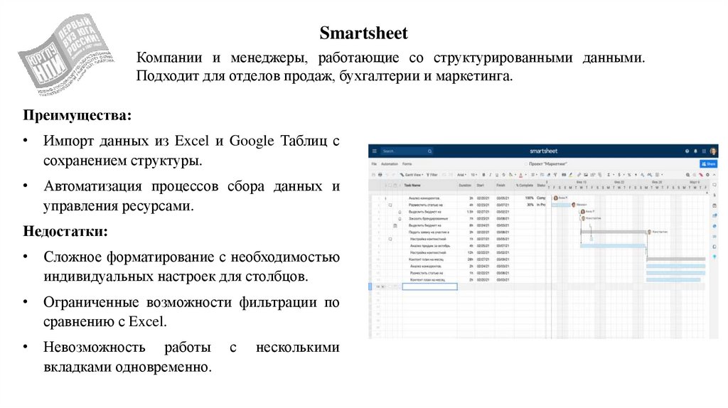 SmartsheetКомпании и менеджеры, работающие со структурированными данными.
