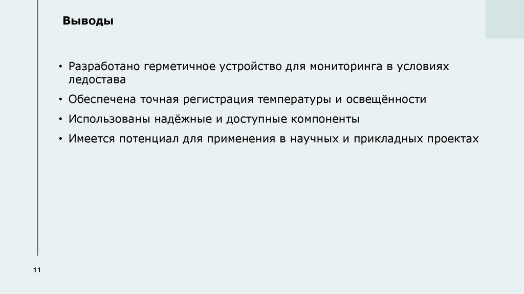 Выводы• Разработано герметичное устройство для мониторинга в условиях