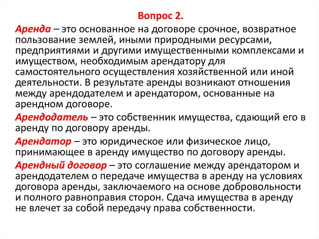 Вопрос 2.Аренда – это основанное на договоре срочное, возвратное