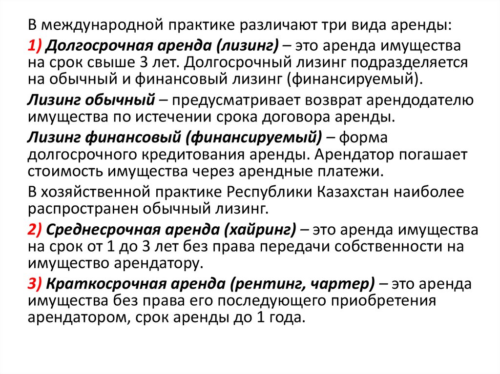 В международной практике различают три вида аренды:1) Долгосрочная аренда (лизинг) – это аренда имущества