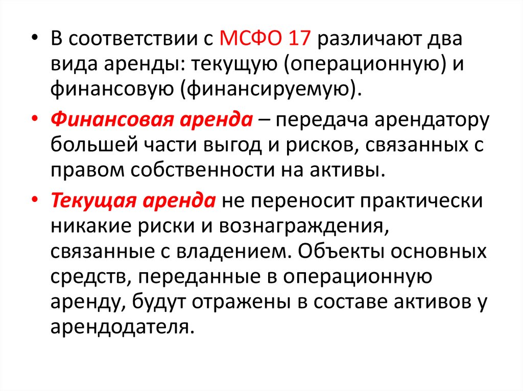 • В соответствии с МСФО 17 различают двавида аренды: текущую (операционную) и