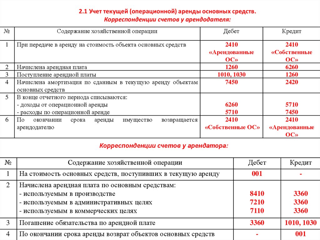 2.1 Учет текущей (операционной) аренды основных средств.Корреспонденции счетов у арендодателя: