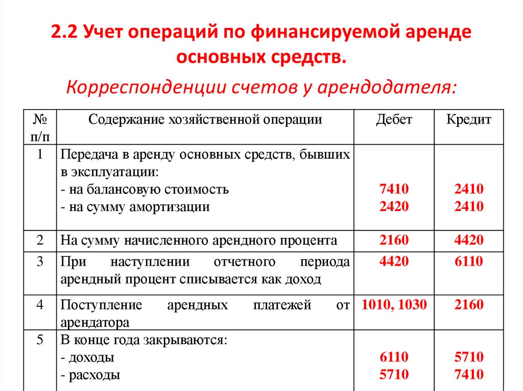 2.2 Учет операций по финансируемой арендеосновных средств.