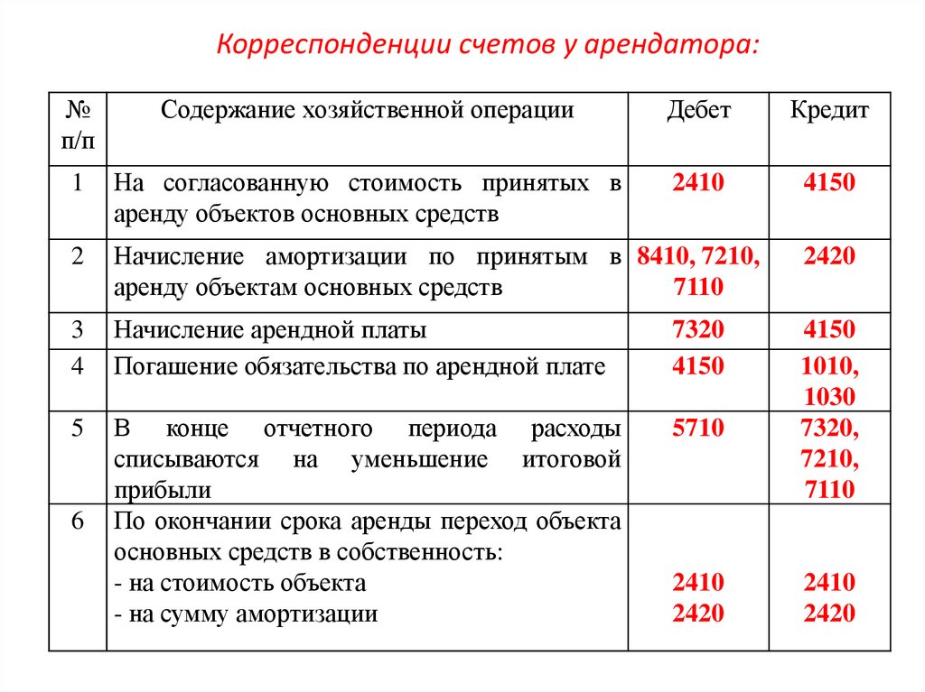 Корреспонденции счетов у арендатора:
