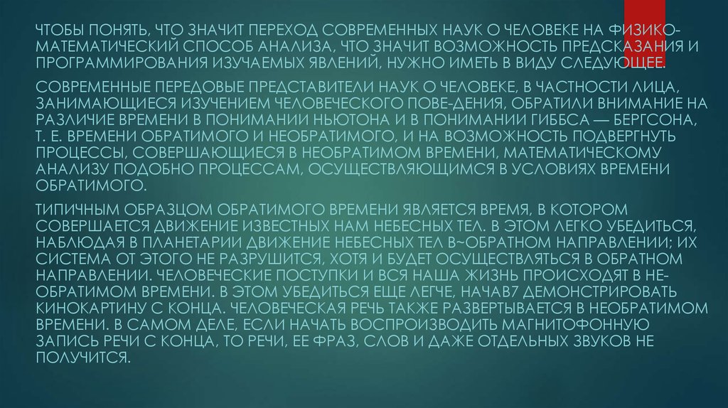 ЧТОБЫ ПОНЯТЬ, ЧТО ЗНАЧИТ ПЕРЕХОД СОВРЕМЕННЫХ НАУК О ЧЕЛОВЕКЕ НА ФИЗИКОМАТЕМАТИЧЕСКИЙ СПОСОБ АНАЛИЗА, ЧТО ЗНАЧИТ ВОЗМОЖНОСТЬ ПРЕДСКАЗАНИЯ ИПРОГРАММИРОВАНИЯ ИЗУЧАЕМЫХ ЯВЛЕНИЙ, НУЖНО ИМЕТЬ В ВИДУ СЛЕДУЮЩЕЕ.