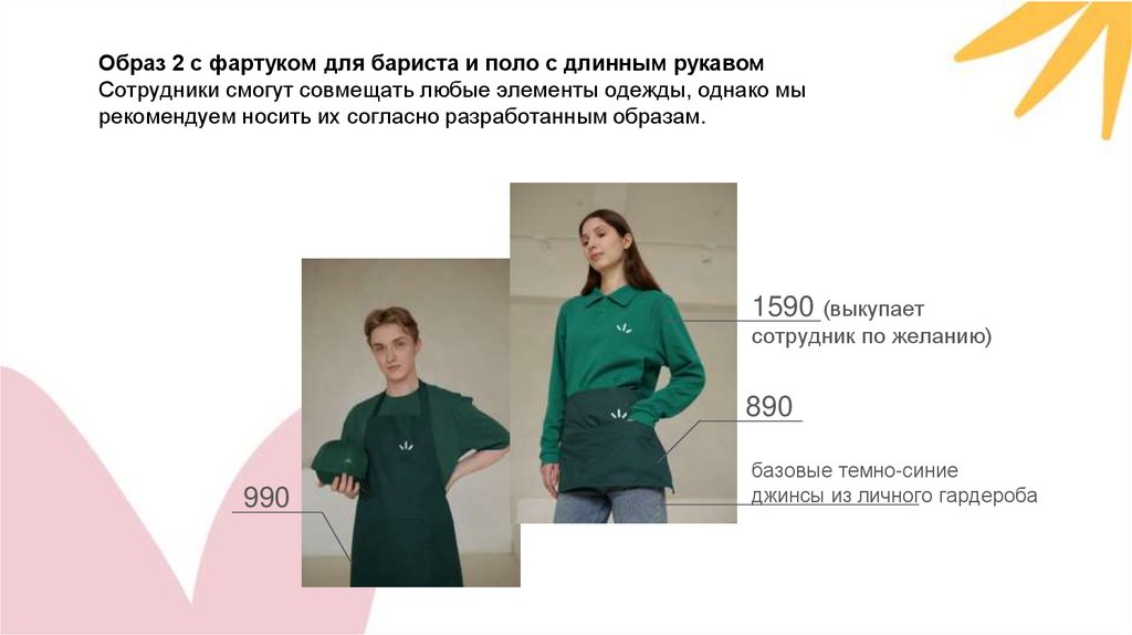 Образ 2 с фартуком для бариста и поло с длинным рукавомСотрудники смогут совмещать любые элементы одежды, однако мы