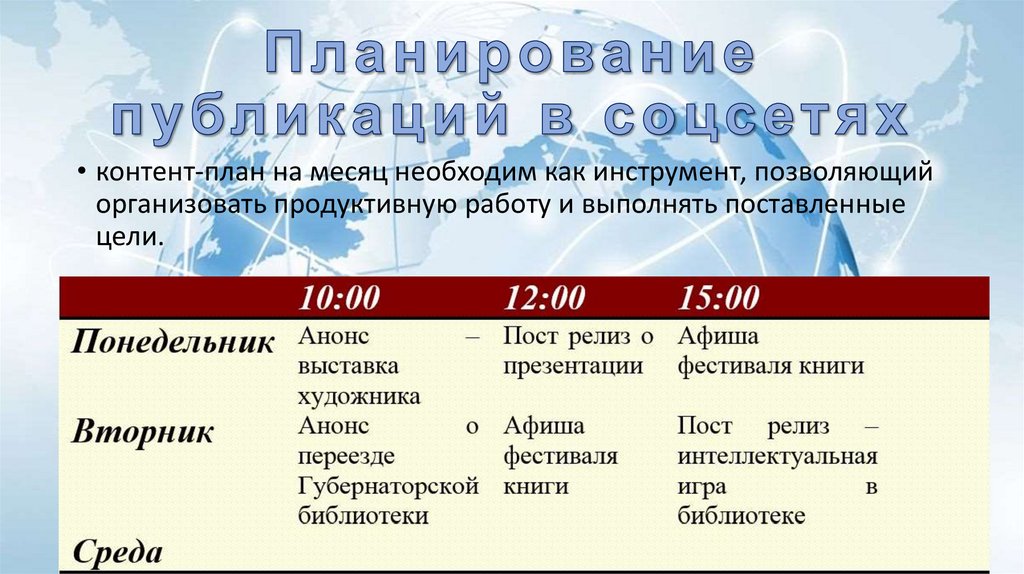 • контент-план на месяц необходим как инструмент, позволяющийорганизовать продуктивную работу и выполнять поставленные