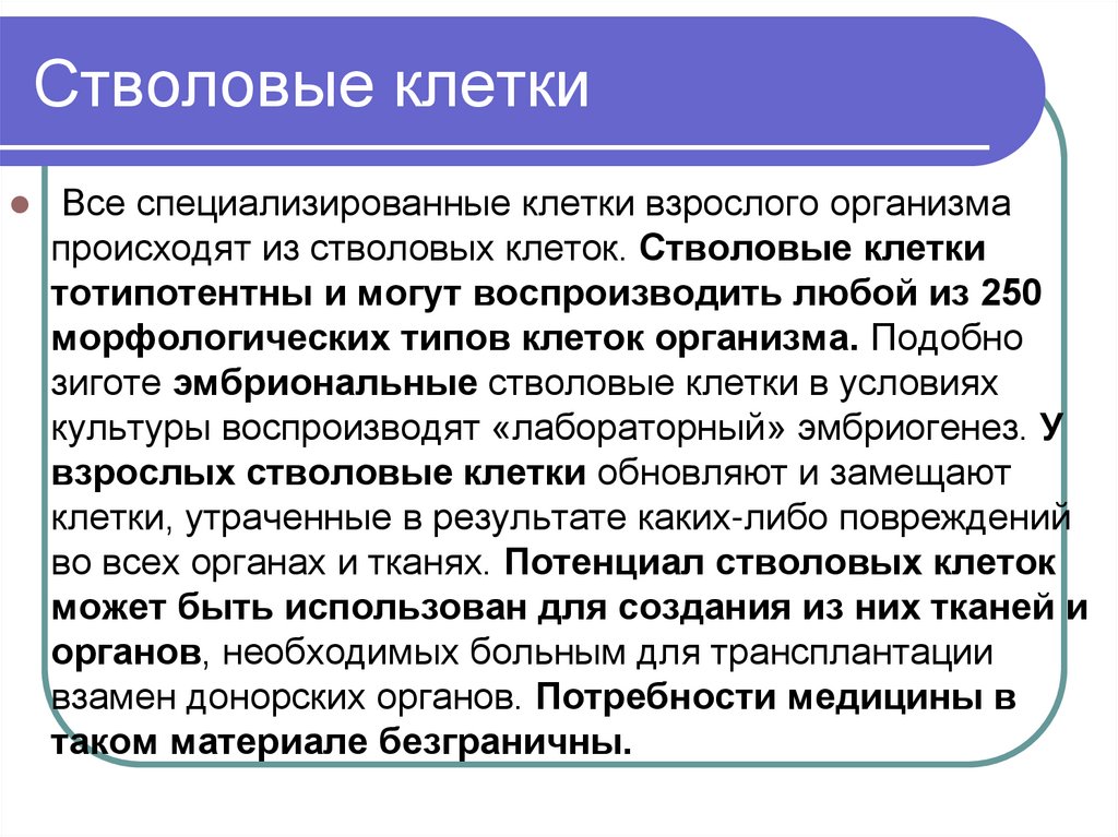 Все специализированные клетки взрослого организмапроисходят из стволовых клеток. Стволовые клетки